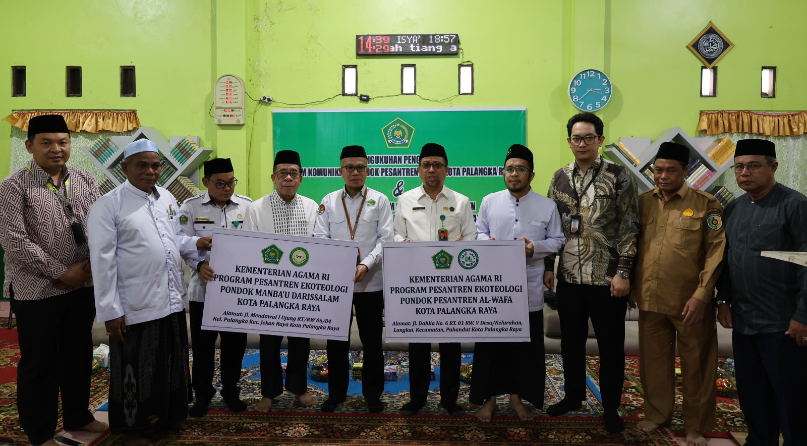 Launching program ditandai dengan penyerahan plang Program Ekoteologi Pesantren kepada pimpinan pondok pesantren oleh Kakanwil Kemenag Kalteng H. Yusi Abdhian bersama Kepala Kemenag Kota Palangka Raya H. Muhidin Arifin.